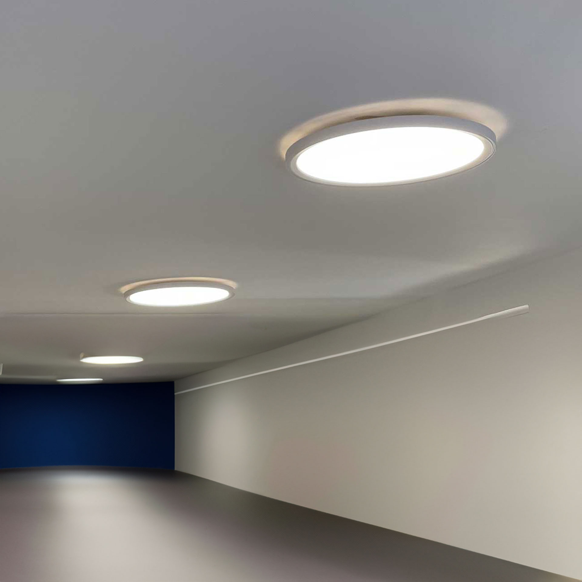 Genießen Sie eine angenehme Atmosphäre mit dem stimmungsvollen Backlight der AMBIENTA Deckenleuchte. Optional sind farbige Backlight-Diffusoren in Amber, Rot oder Blau verfügbar, um Ihrem Raum eine individuelle Note zu verleihen. Nutzen Sie das farbige Backlight zur Wegekennzeichnung oder als stilvolles Element zur Unterstreichung Ihrer Corporate CI.