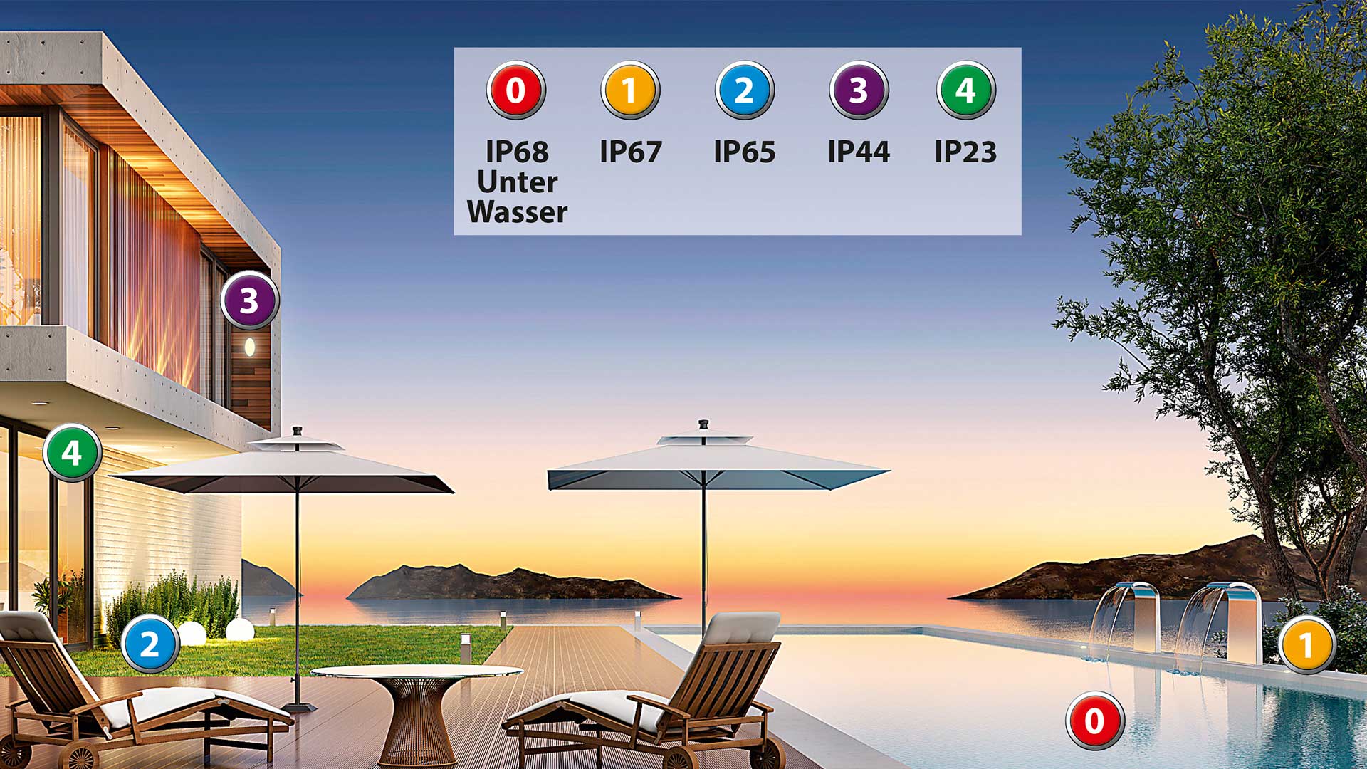 Für Beleuchtung im Außenbereich gelten spezifische Anforderungen an die IP-Schutzarten. Hier sind einige gängige Schutzarten und ihre Anforderungen: